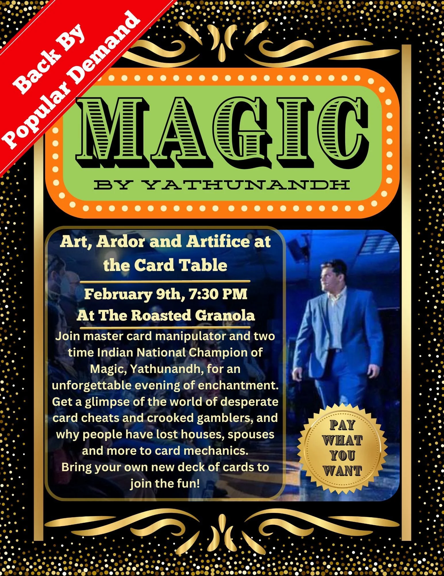 Art, Ardor and Artifice at the Card Table returns to The Roasted Granola (https://www.roastedgranola.com/ (https://www.roastedgranola.com/)) on Friday, February 9, 2024 from 7:30-8:40 pm with brand new magic! "Step into the enchanting world of Art, Ardor and Artifice at the Card Table. The show takes you on a rollercoaster ride with this master card manipulator. Get a glimpse of the world of desperate card cheats and crooked gamblers, and why people have lost houses, spouses and more to card mechanics. From the underbelly of mob run casinos and Mississippi riverboats all the way to the beckoning lights of the Vegas strip, you get to experience world class card table artifice and masterful sleight of hand magic where cards come to life and leave you questioning reality." Bring a new deck of cards to join the fun! (not mandatory) The show begins at 7:30 and is free of charge(Pay what you wish!). We would recommend you are seated at least 10-15 minutes before the show begins.