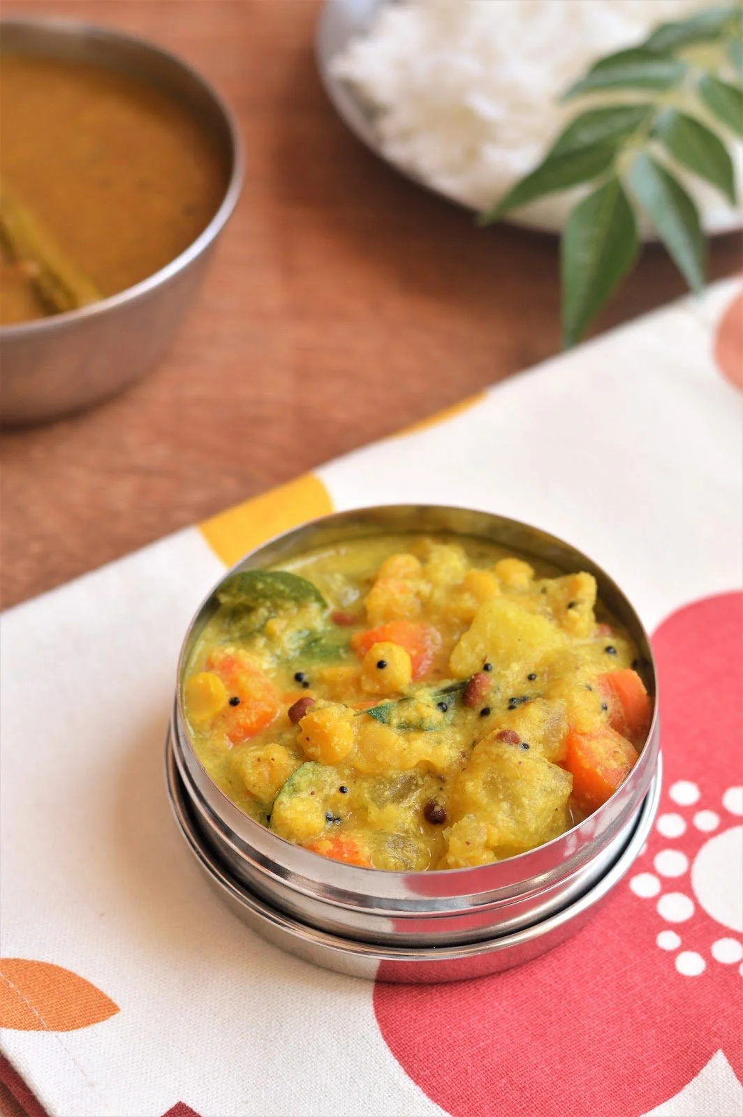 Mixed veggie kootu is a wholesome and nutritious South Indian dish made from a blend of different vegetables, typically cooked with lentils and spiced with mild herbs. The vegetables commonly used include carrots, beans, among others.